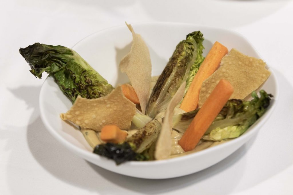 Finalizar el plato de Hummus con los cogollos marcados, los bastones de zanahoria y el pan de lentejas crujiente.