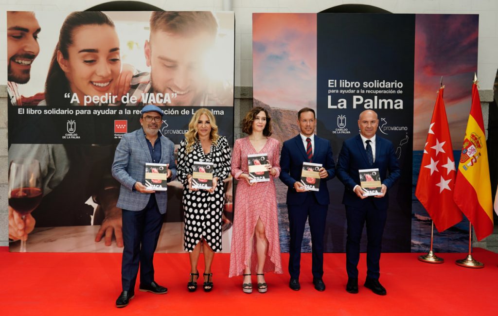 El sector del Vacuno de Carne ha presentado en la sede de la Comunidad de Madrid el lanzamiento de “A pedir de vaca”, un libro solidario que busca recaudar fondos para ayudar en la recuperación de La Palma. El libro, que ya se puede adquirir en todos los puntos de venta de nuestro país, cuenta con recetas de Carne de Vacuno de 27 chefs estrella Michelín, que han puesto ilusión y creatividad al servicio de La Palma.
