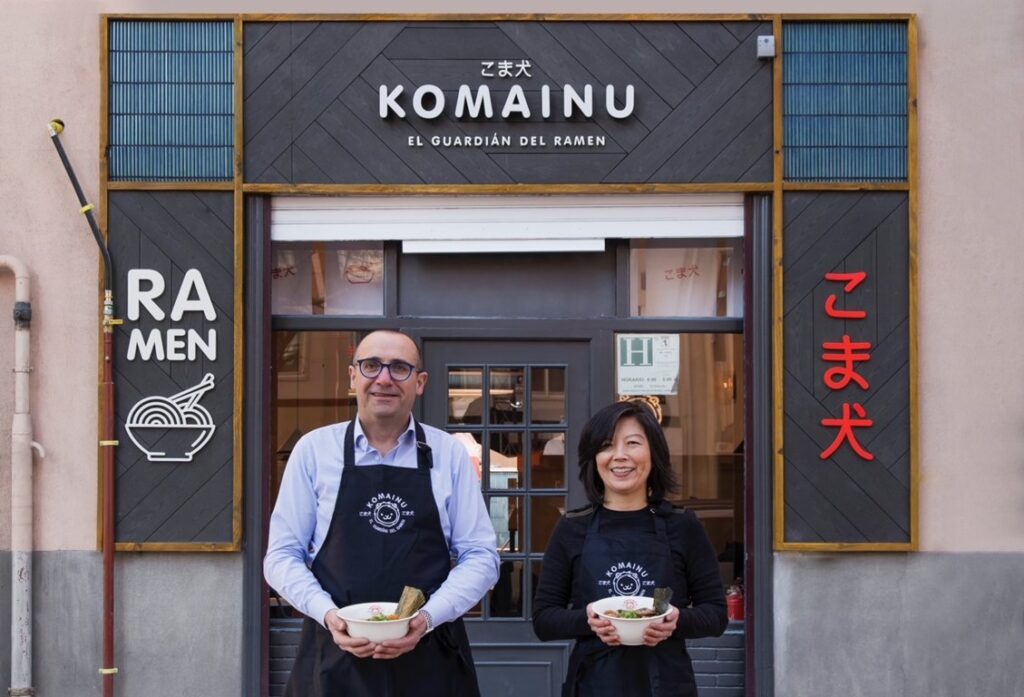 Ramen Komainu, líder en ramen gourmet para disfrutar en casa, se ha hecho eco de la petición más repetida por sus seguidores y estrena restaurante en la madrileña calle José Abascal, 13, barrio de Chamberí, en el entorno de la emblemática zona de restauración de Ponzano. En la imagen, Gonzalo Ibáñez y Aska Okumura, creadores de Ramen Komainu.