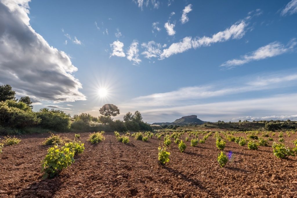Se recupera la marcha en los mercados exteriores para la DOP Jumilla. Los datos de la campaña 2020-2021 se incrementan un 11%, lo que representa un crecimiento histórico de las ventas. En la imagen, atardecer en el paraje Las Puntillas, dentro de la DOP.