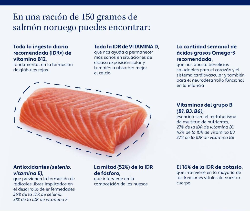 ¿Sabías que más de 21 millones de raciones con Salmón de Noruega se consumen cada día alrededor del mundo? ¡1,4 millones, sólo en España! Lo que muchos no saben es que una ración de 150 gramos de salmón cubre las necesidades semanales de Omega 3 recomendadas y la cantidad de vitamina D diaria. Además, es fuente de algunos minerales esenciales como el fósforo y el potasio y antioxidantes como el selenio y la vitamina E.