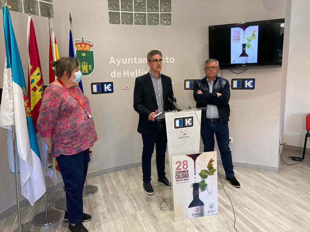 El Ayuntamiento de Hellín (Albacete) acogió la presentación de la vigésimo octava edición del Certamen de Calidad Vinos DOP Jumilla, que, por primera vez en su historia desde 1994, se celebrará en la ciudad de Hellín los días 7 y 8 de junio. En la imagen, Maria Jesús López Iniesta, concejal de Hellín; Silvano Garcia, presidente de la DOP y Ramón Garcia, alcalde de Hellín, durante el evento.