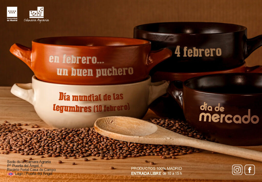 Teniendo en cuenta los rigores invernales y los casi inevitables excesos de las celebraciones navideñas que quedaron atrás, indudablemente es tiempo de legumbres y verduras, de platos calentitos cocinados a fuego lento que reconforten el ánimo. Por eso, los pucheros serán los protagonistas en la nueva edición del Día de Mercado, que tendrá lugar en la sede de la Cámara Agraria de la Comunidad de Madrid, en la Casa de Campo, el próximo sábado, 4 de febrero, de 10 de la mañana a tres de la tarde.