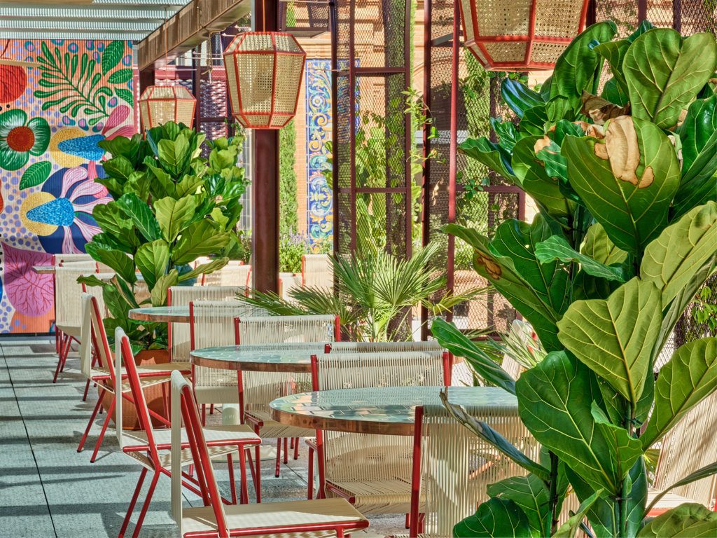 Por supuesto, Torcuato no será solo para el verano y la terraza es un anticipo de lo que vendrá en otoño. Sus espacios interiores diseñados, como todo, por Pepe Leal se inspiran en los gabinetes de curiosidades de la época, en los palacetes de la burguesía repletos de recuerdos de sus periplos. Elegancia europea, reminiscencias asiáticas, colores tropicales… “Tan ecléctico como los años de los que que data el edificio. A finales del siglo XIX estaba muy de moda mezclar estilos distintos”, comenta el interiorista haciendo referencia a un “neo siglo XVII y hasta un granadino pasando por el clasicismo francés”. Al fresco todo se torna más contemporáneo y es aquí, en la zona al aire libre, la que de momento está abierta, donde se percibe el estallido de lo exótico con multitud de plantas, trepadoras que cubren unas preciosas arcadas perfiladas con neones, murales entre lo aborigen y lo pop y siempre ese ladrillo rojo tan característico de Madrid.