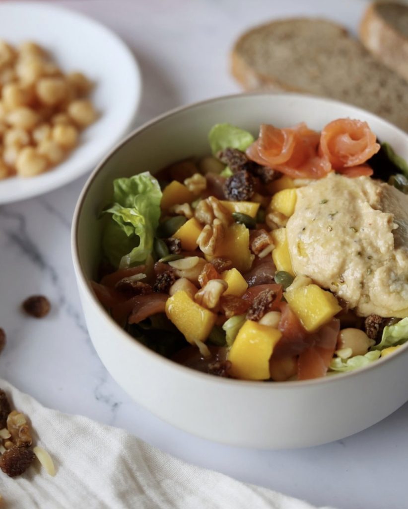 Elaboración: El plato es tan sencillo que solo se tardará cinco minutos en elaborarlo. Se pone en un bol el mézclum de lechugas variadas, junto con el salmón ahumado y el mango troceado (cantidad al gusto). Se decora con frutos secos y se añade el hummus como aliño. De esta forma, en un solo plato, se consume frutas, pescado, verduras y legumbres. Una receta equilibrada y con un aporte de proteínas y fibra ideal para los meses de verano y para combatir el calor.