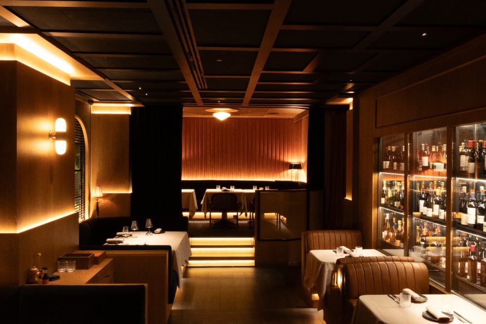El elegante interior del restaurante Noble en Valencia destaca por su iluminación cálida.