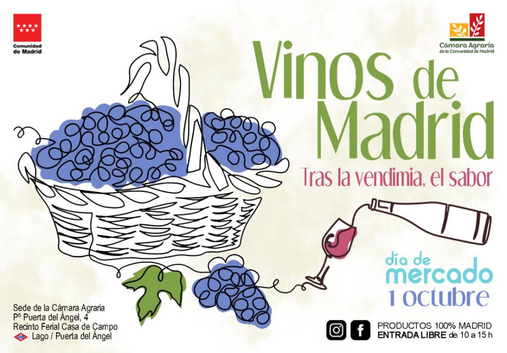 Llega el otoño, llega la época de la vendimia y llega una nueva edición del Día de Mercado de la Cámara Agraria, en la que tendrán especial relevancia los vinos de la Comunidad de Madrid, representados en esta ocasión por diez bodegas de distintos puntos de la región. El Día de Mercado se celebra el sábado, 1 de octubre, en la Casa de Campo en su horario habitual de diez de la mañana a tres de la tarde.