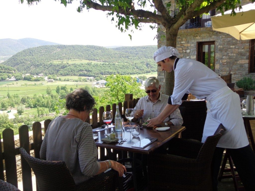 Hecho en los Pirineos, I Congreso del Producto y la Gastronomía de los Pirineos, ha completado su programación, que reúne en Huesca a lo largo de cuatro días, del 18 al 21 de marzo, un elevado número de debates, mesas redondas, talleres, conferencias, degustaciones, demostraciones de cocina, un ciclo de cine y cocina, exposición de productos y libros, etc. En la imagen, la terraza del restaurante Callizo, en Aínsa.