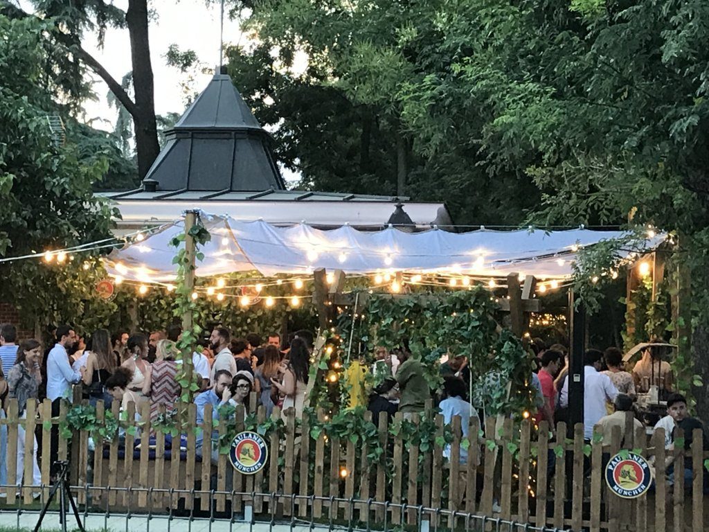 El castizo Palacete de Rosales, emblemático kiosco madrileño situado junto al Templo de Debod, se convierte este verano, por obra y gracia de Paulaner, en un auténtico biergarten bávaro.