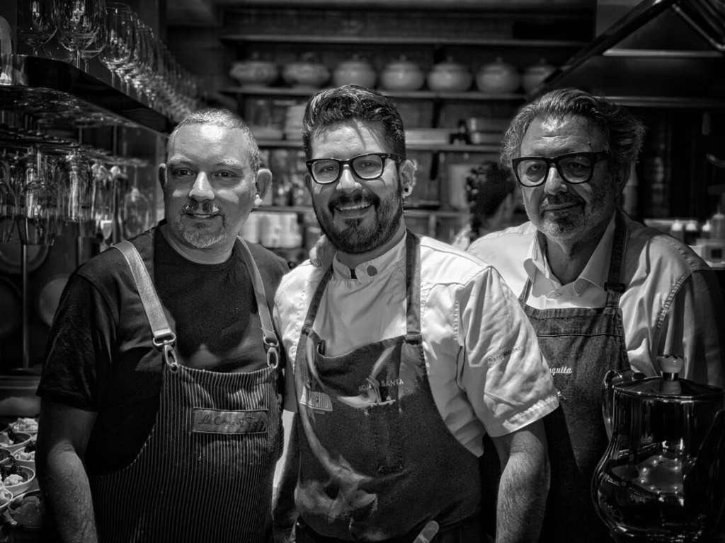 Albert Adrià, máximo representante de elBarri, y Paco Méndez, chef de Hoja Santa, reinterpretaron el pasado lunes 25 un mole de olla mexicano como parte de la iniciativa de Juanjo López Bedmar #elcocidodetodos. En la imagen, Albert, Paco y Juanjo, en La Cocina de Frente.