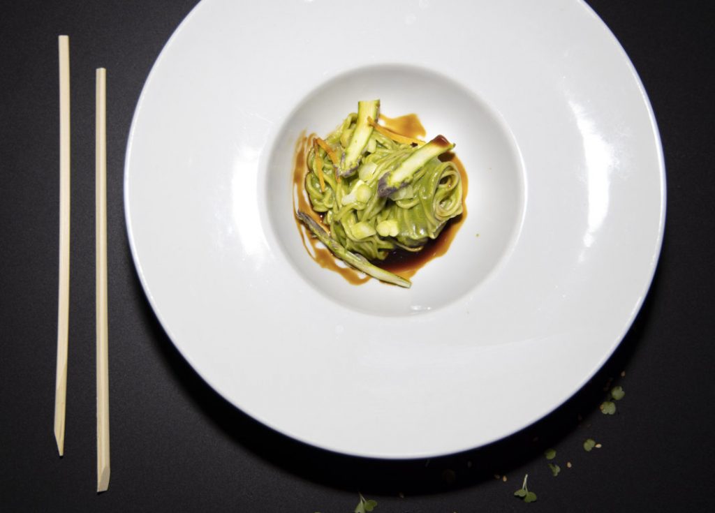 Juan Carlos Reyes ha llegado a la final de los ACA con su receta Asian green noodles & alioli de menta y albahaca. Se trata de un curry verde de espinacas con noodles, espárragos y una juliana de limón y kunkuat (cítrico conocido como naranja enana) y acompañado con un alioli de hierbas.