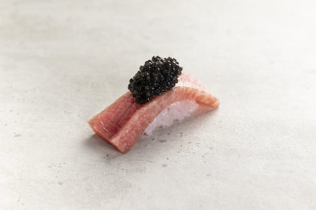 Tras dos años desde la apertura de Kappo, el chef Mario Payán incluye en su propuesta un menú solo de nigiri. Su conocido como “festival de nigiri” se convierte ahora en menú para aquellos amantes de estas piezas que el propio chef elabora en directo desde la barra del restaurante. Esta propuesta, que se suma al menú degustación ya vigente “Super Mario”, está compuesta de un entrante, 15 piezas de sushi y un postre. Con un precio de 65€ está disponible de martes a sábado en horario de comidas. En la imagen, un nigiri de atún rojo y caviar.