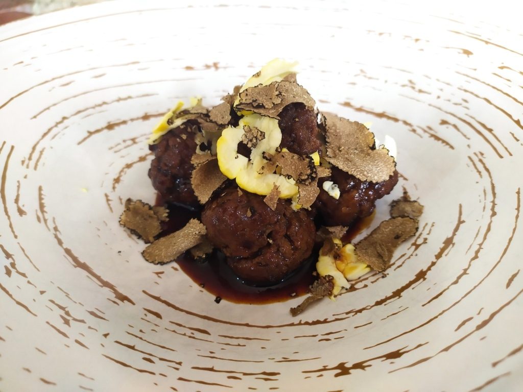 Dos elaboraciones a cargo del responsable de La Botica de Matapozuelos, un restaurante con una estrella Michelín, apuestan por aromas y sabores de temporada para alcanzar la excelencia gastronómica con productos sostenibles, sociales y de kilómetro cero. En la imagen, sus albóndigas de cordero, castañas y trufa.