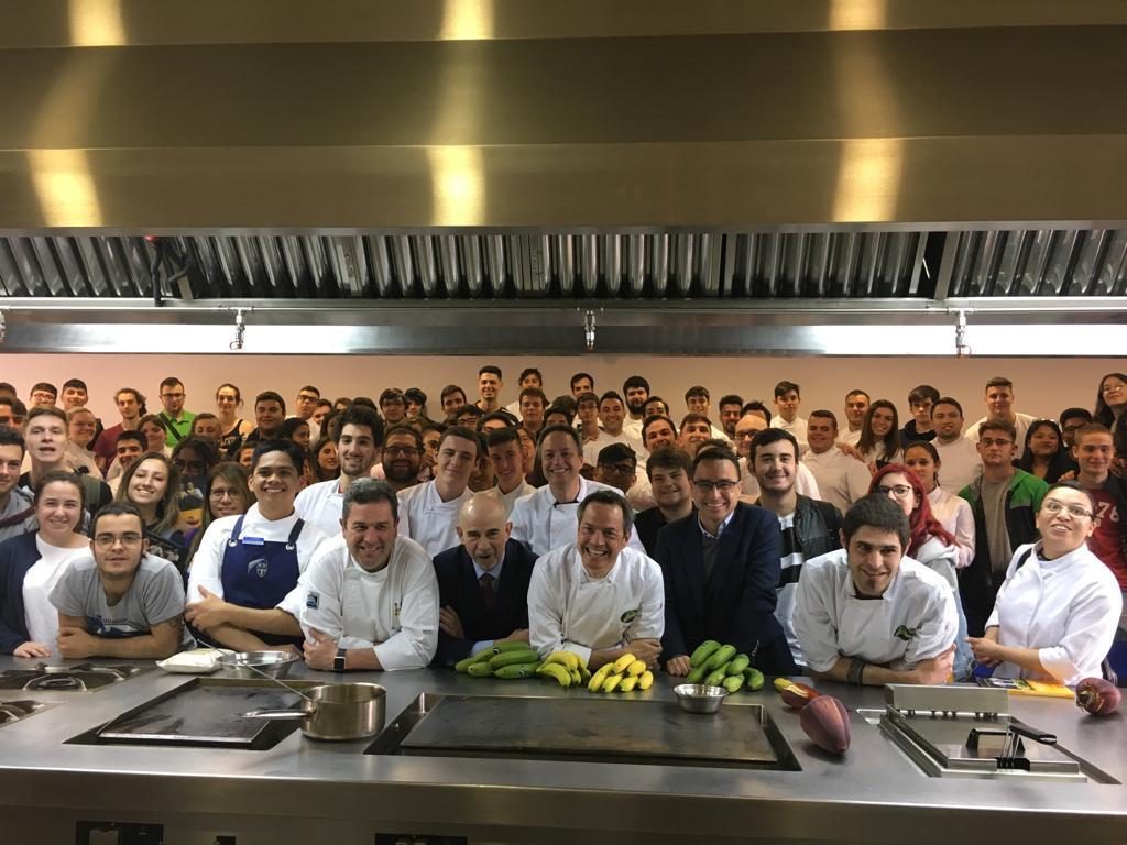 Los chefs Sergio y Javier Torres, reconocidos cocineros con dos estrellas Michelin, impartieron el pasado lunes una Clase Magistral a más de 200 alumnos de la Escuela de Hostelería de Madrid. Esta sesión inicia así la serie de clases magistrales que los Hermanos Torres impartirán en diferentes escuelas de hostelería en España con el objetivo de enseñar a los estudiantes las posibilidades que el plátano cultivado en las islas puede ofrecer dentro de la cocina profesional.