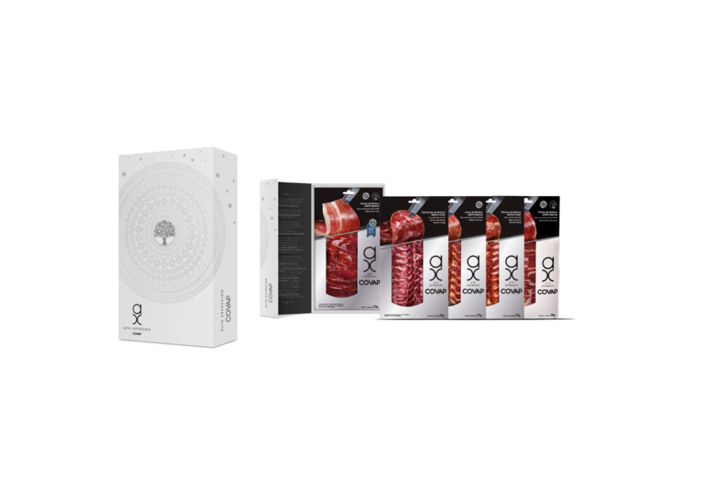 - ESTUCHE CATA ALTA EXPRESIÓN COVAP: este pack de degustación contiene cinco loncheados cortados a cuchillo de 70 g de jamón, paleta, lomo, salchichón y chorizo de bellota 100 % ibérico. Caja de regalo con diseño exclusivo. V.P: 59 €