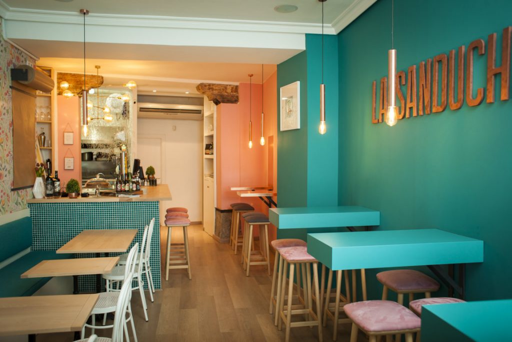 La Sanducherie es un local pequeño y acogedor. Diseñado por el estudio de interiorismo La Casita de Margaux, quiere recordar a las hamburgueserías americanas de los años 60, con cierto toque ‘vintage’ aunque actualizado gracias a sus lámparas de estilo industrial y el papel multicolor de sus paredes.