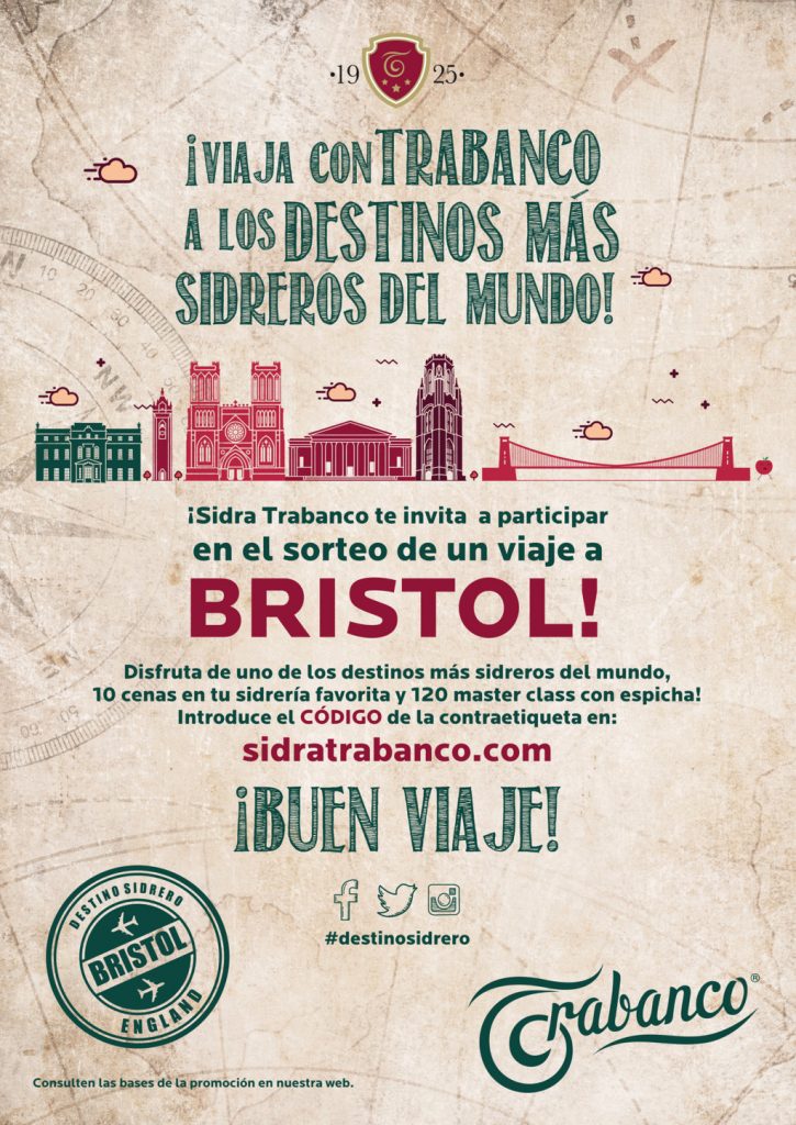 Hasta el próximo 16 de Abril adherida a la parte trasera de todas las botellas de Sidra Trabanco aparecerá una etiqueta con el logotipo de Destino Sidrero junto con un código numérico de 8 dígitos. Introduciendo ese código junto con los datos personales en la página www.sidratrabanco.com esa persona entra en el sorteo de una de las Master Class con espicha, cenas en la sidrería donde haya consumido la botella de sidra, y el premio estrella… Un viaje a uno de los destinos más sidreros del mundo, Bristol!!!