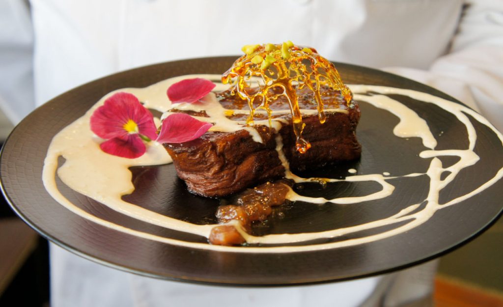 Se trata de una original receta elaborada con  puré de frambuesa, mermelada  de  higos y Micuit de foie artesano. Decorada de forma espectacular con una estructura de caramelo y  flores pensamientos comestibles.