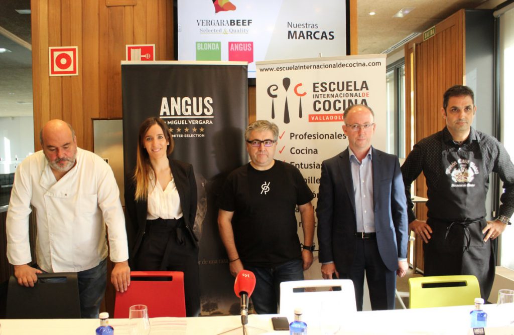 La Escuela Internacional de Cocina de la Cámara de Comercio de Valladolid albergó la presentación oficial de las I Gastroexperiencias Angus by Miguel Vergara, una iniciativa que pretende acercar al público diferentes propuestas culinarias elaboradas con este tipo de carne considerada como una de las mejores del mundo. Para ello, los restaurantes Dámaso (Valladolid), Casa Pedro (Herrera de Duero, Valladolid) y Rivas (Vega de Tirados, Salamanca) ofrecerán del 1 al 31 de octubre (del 1 al 14 en el caso de Casa Pedro) una serie de menús con la carne Angus de Grupo Miguel Vergara como elemento principal.