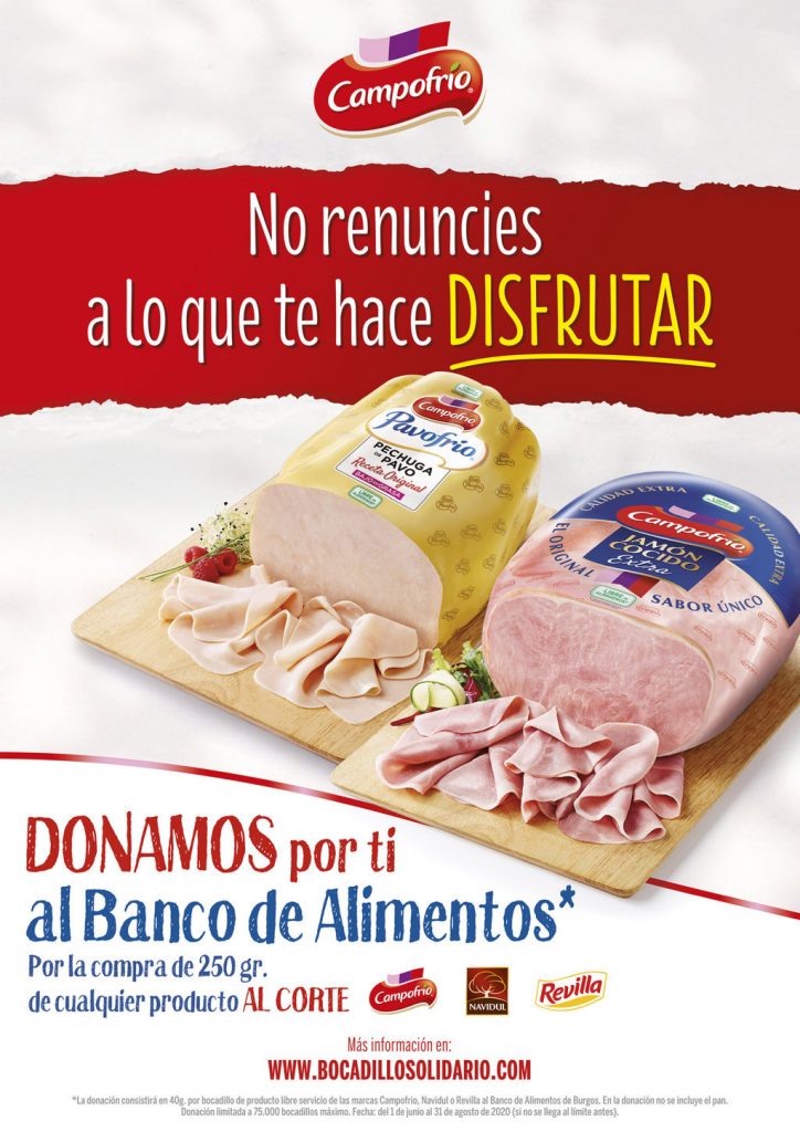Campofrío ha lanzado la iniciativa ‘Campofrío dona por ti’, por la que la Compañía donará producto al Banco de Alimentos de Burgos con las compras que hagan los consumidores. En concreto, por cada 250 gramos de producto al corte vendido de sus marcas Campofrío, Navidul o Revilla, la compañía donará 40 gramos – el equivalente al relleno de dos bocadillos – a la institución burgalesa.