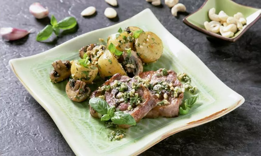 Para el aliño, se machacan las avellanas peladas junto con el resto de ajos y las hojas de albahaca, con un pellizco de sal y el vinagre de Jerez y se sirve sobre la guarnición y las chuletas en el último momento de cocción, terminando de cocinar el conjunto.