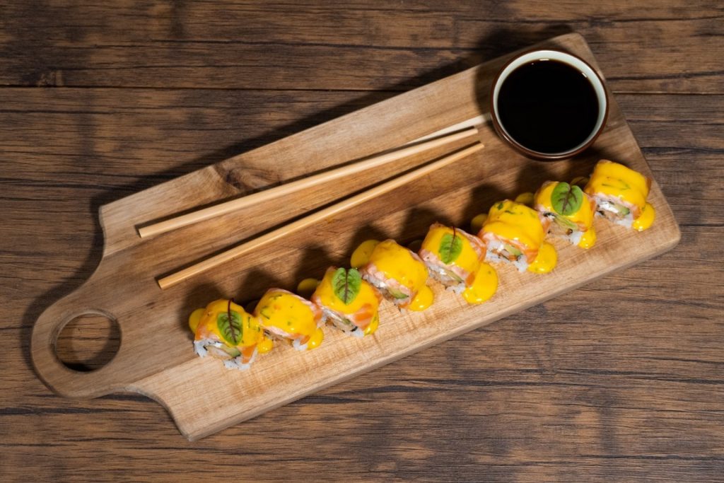 Acevichado (maki de langostino en panko con aguacate, terminado con láminas de corvina bañadas de salsa acevichada)
