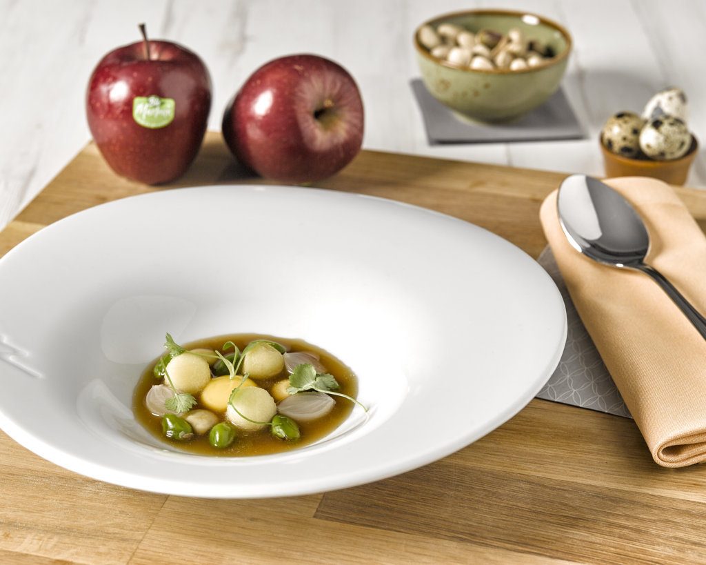 El chef español Miguel Ángel Mayor, una estrella Michelin por su restaurante Sucede en Valencia, ha ideado varias recetas para Bio Marlene. El cocinero se apodera de uno de los ingredientes más versátiles en la cocina, la manzana, para elaborar tres propuestas gastronómicas perfectas que conforman un menú otoñal de diez: Guiso de manzana y frutos secos con consomé de caza (en la imagen); Raviolis de manzana con alubias y morcilla; y Vino de manzana y bizcocho de nata montada.
