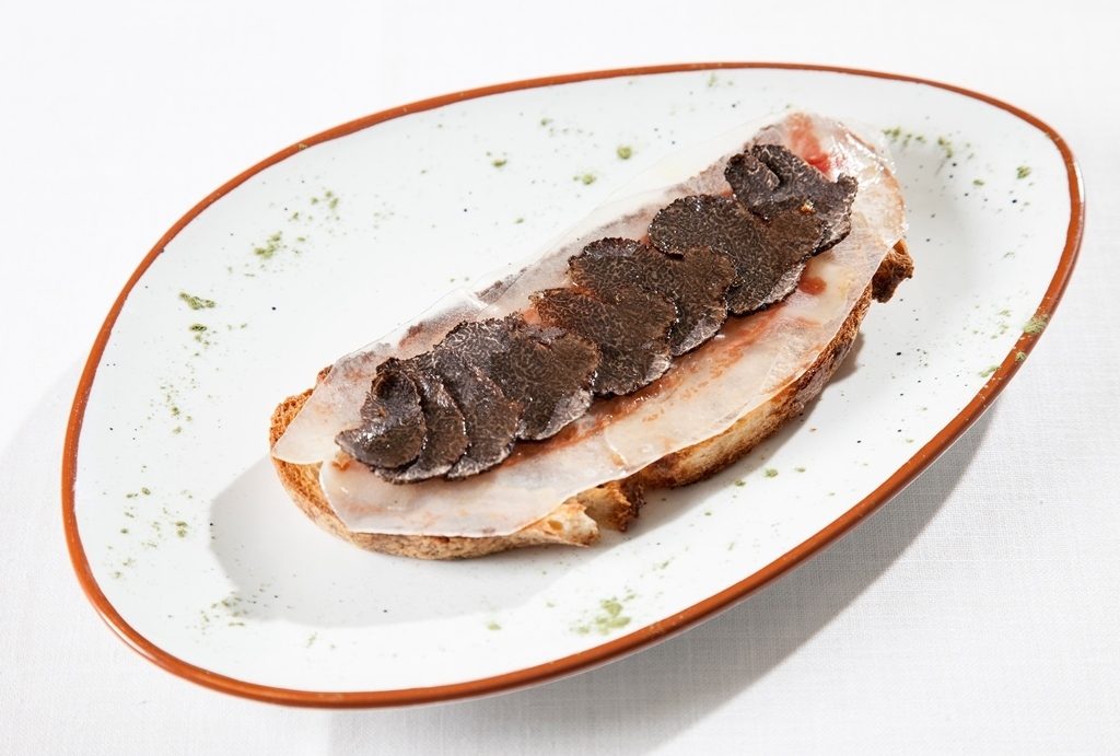 Media Ración (Beneficencia, 15. Madrid) inaugura 2021 con una nueva edición de sus Jornadas Gastronómicas de la trufa. Decisión lógica teniendo en cuenta que enero es el mes de la trufa negra (Tuber Melanosporum), ya que en estos días el delicado producto se encuentra en su mejor momento. En la imagen, la tosta de papada ibérica y trufa Tuber Melanosporum