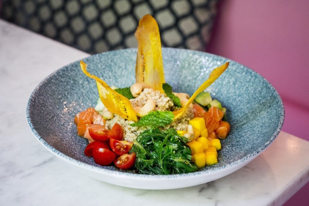 – POKE DE SALMÓN: el poke es una ensalada de pescado crudo servida como aperitivo o plato principal en la cocina hawaiana. Hecho con salmón en dados marinado en lima, soja y sésamo, viene sobre una base de quinoa orgánica cocida, acompañada con mango, tomate cherry, pepino, alga wakame (en Japón se utiliza en la elaboración de la sopa