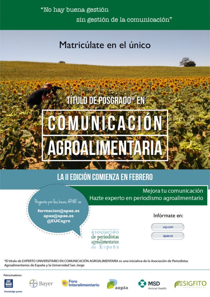 Continúa abierto el plazo de inscripción y matrícula de la segunda edición del Curso de Experto Universitario en Comunicación Agroalimentaria. El curso, el único de estas características que se ofrece en España, es un título propio de la Universidad San Jorge, auspiciado y orientado por la Asociación de Periodistas Agroalimentarios de España (Apae), que es la organización profesional de referencia.