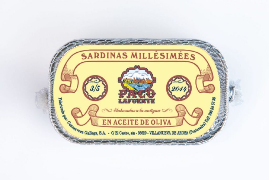 Ahora Conservera Gallega, S.A, con Paco Lafuente, su marca más tradicional, ha creado la gama de conservas milesimadas. Las sardinas de la añada 2014 con un contenido de 3 a 5 piezas (PVP: 3,60 €) y las sardinillas de la añada 2016, que contiene de 22 a 24 piezas (PVP: 5,75 €). Su etiqueta vintage recuerda a aquellas latas que se exponían en las antiguas tiendas de ultramarinos y que pueden ser el perfecto regalo para coleccionistas gourmets.