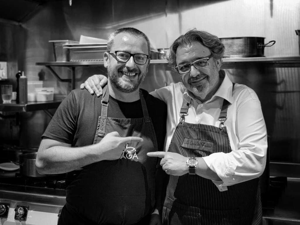 El cocinero jienense Pedro Sánchez, una estrella Michelín en Bagá, ofreció un cocido andalusí de 7 pases en el restaurante madrileño La Cocina de Frente (Bulevar de Ibiza, Bulibiza), con el que se metió en el bolsillo a una treintena de comensales entregados. Juanjo López ejerció de maestro de ceremonias presentando a Pedro Sánchez a unos comensales ávidos de conocer un pellizco de Bagá. En la imagen, los dos chefs.