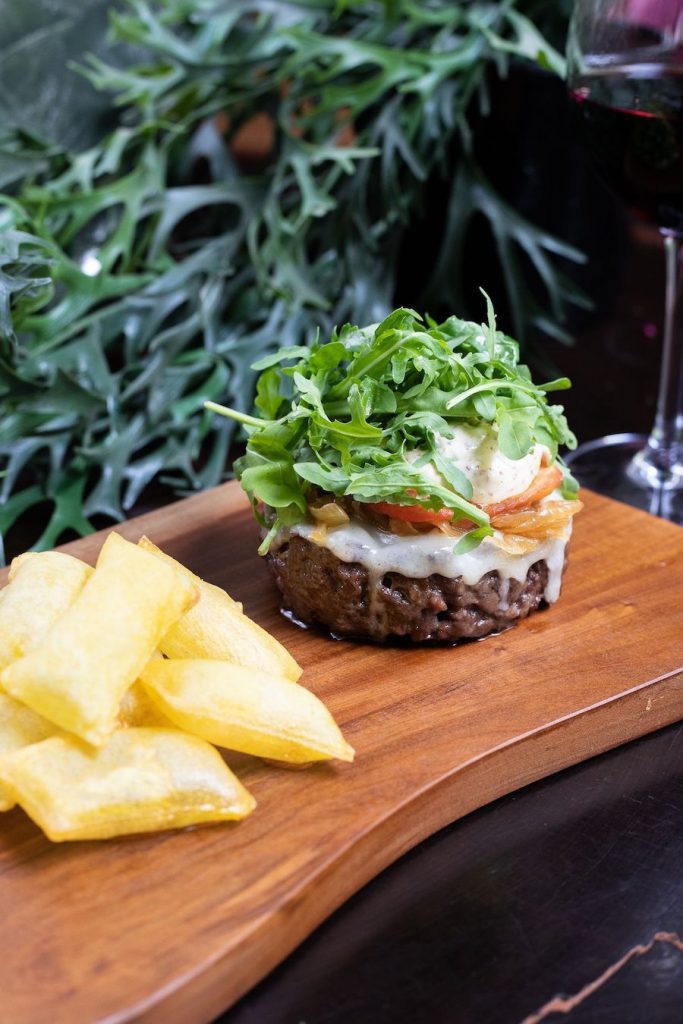 Baby Grill, el pequeño restaurante informal contiguo a Rubaiyat en el que degustar algunas de sus especialidades en formatos y precios más asequibles, da nombre al recién lanzado servicio de envío a domicilio del Grupo Rubaiyat a través de Glovo. En la imagen, su famosa hamburguesa con patatas suflé de guarnición..