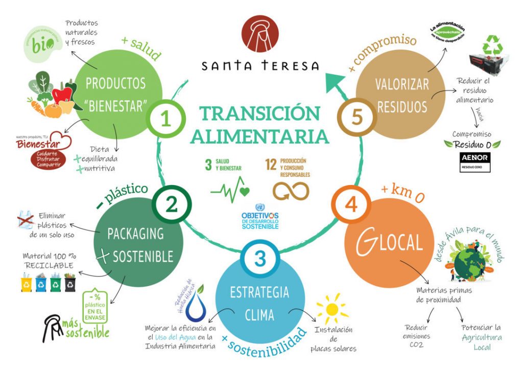 La empresa de alimentación radicada en Ávila trabaja desde hace meses en la implementación de una estrategia de transición alimentaria basada en el equilibrio entre sostenibilidad y producción “más saludable”. A través de un comité creado  ad hoc, formado por técnicos de compras y marketing, se ha desarrollado un plan de acción entorno a los Objetivos de Desarrollo Sostenible 2030, y en concreto centrándose en los ODS 3 (Salud y Bienestar) y el ODS 12 (Producción y Consumo responsables), como pilares fundamentales.