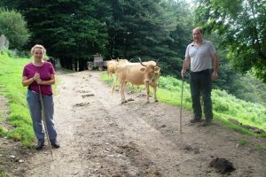 unas vacaciones decentes pero están decididos, a pesar de las dificultades, a recuperar la raza bovina autóctona Betizu, que cuenta actualmente con apenas 600 cabezas en Navarra, a las que se pueden añadir otras 200 en Guipúzcoa y 50 más en Vizcaya. De hecho, Pili, propietaria de unos 60 animales, es la presidenta de su asociación navarra de criadores (Asbena), que integran un total de 18 ganaderos y está colaborando con el INTIA para recuperarla y mejorar su comercialización. Incluso hay un proyecto, a cuatro años vista, de hacer buey de tiro. Porque, por el momento, solo venden su carne por lotes a clientes cercanos. Asegura que “la Betizu es una vaca muy rústica, asilvestrada, que se adapta muy bien al territorio y es excelente para la limpieza de los montes en su labor de cortafuegos. De alzada pequeña, se pasan todo el año en el monte y como saben moverse por lugares por lo que habitualmente no entra el ganado, solo necesitan que les subamos alimento, sobre todo hierba seca, en los meses más duros del invierno. A las nuestras las conozco por su nombre, son casi como de la familia. La calidad de su carne es excelente, de un sabor exquisito, derivado de su alimentación natural, El otro día comimos
