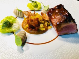 de todo fundamentalismo, reivindica también con entusiasmo la calidad de las carnes, curadas y frescas, procedentes de los cerdos de la raza Torbiscal de Mio 1898. Compartimos con él ruta y degustación por el valle de los Pedroches y nos cuenta lo que aportan a su cocina estas carnes: “Son tan buenas que no les hacen falta grandes tratamientos, apenas una cocción directa. Consiguen protagonismo por sí mismas. A mí me gusta preparar las mejores piezas con tomates secos, quizá con un queso Parmesano o Manchego y un poco de rúcula. Otra alternativa puede ser, al modo Tandoori, con un yogur con especias y un pesto de remolacha”. Ferreruela cree que “la más fácil de trabajar es la presa por su forma y tamaño, y presentarla por ejemplo en carpaccio, pero también me da mucho juego la pluma, muy acintada, que solemos trabajar en brocheta, lo que nos permite controlar mucho la cocción. El secreto me interesa especialmente en pequeña cantidad por esa textura que tiene de corteza de cerdo y, respecto a la papada, como es más gelatinosa, cuando la doras bien ofrece un crujiente muy interesante. Al ser la más grasa, mejor presentarla en formato de tapa”. Para acompañarlas, nos sugiere un blanco seco con madera, tipo Albariño o Riesling, “pero la presa demanda quizá un tinto, con una cierta acidez, y para el secreto, un cava de larga crianza me parece un acompañante perfecto”.
