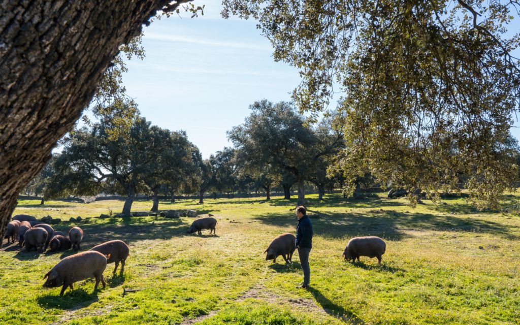 para dar calor a los lechones en los meses de invierno) y que es el punto de partida. Luego, los cerdos de la singular raza Torbiscal disfrutan de la mayor parte de su vida en diferentes escenarios de la dehesa, en un radio de acción de unos 30 kilómetros, alimentándose a sus anchas de bellota en el curso de la montanera. El bienestar animal es, en todas las fases, una de las prioridades de la empresa.