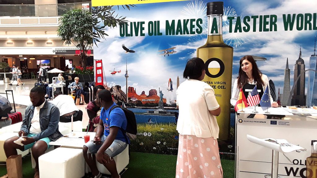 Aceites de Oliva de España y la Unión Europea han puesto en marcha el “Olive Oil Lounge” en el aeropuerto de Hartsfield-Jackson de Atlanta en el marco de la campaña global “Join the European life style with Olive Oils from Spain. Olive Oil Makes a tastier World”, que está recorriendo las principales ciudades de Europa, Estados Unidos y Asia. Este aeropuerto es lugar idóneo para llevar el mensaje de la campaña a viajeros de prácticamente todos los rincones de la Tierra. Las cifras son impresionantes. Se operan vuelos 150 destinos en EEUU y más de 75 internacionales de 50 países. Cada día acoge 2.700 vuelos y 275.000 pasajeros. Estamos hablando del único aeropuerto que supera los 100 millones de pasajeros al año (104 millones según las últimas estimaciones), muchos de los cuales podrán acercarse a la cultura del Aceite de Oliva por primera vez y familiarizarse con un ingrediente versátil para cualquier gastronomía.