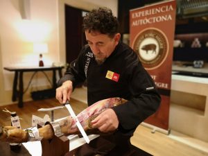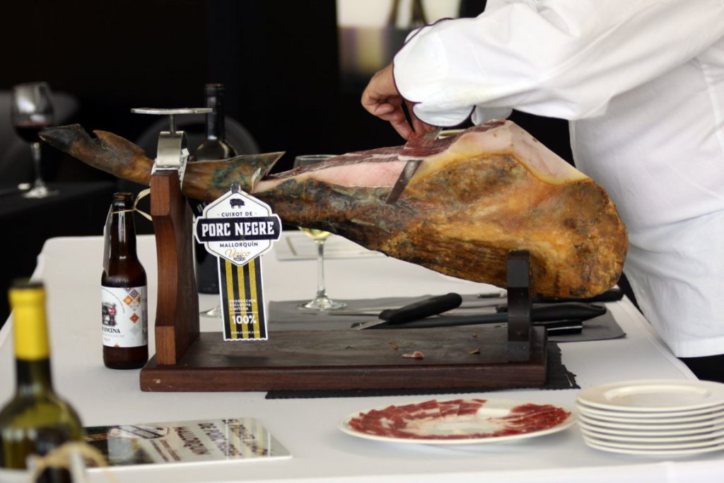 En nuestro viaje a Mallorca alrededor del Porc Negre, estuvimos presentes en dos catas con Sanchidrián, desarrolladas, respectivamente en el Park Hyatt Hotel y en la Rafa Nadal Academy. En ambas, el acreditado cortador y embajador de España Global, siempre espectacular, ha explicado las peculiaridades de esa raza: “Es ‘prima’ del Ibérico, con más volumen y menos agilidad atlética. Está sacando jamones muy interesantes, con un sabor muy agradable y bien potente en boca”.