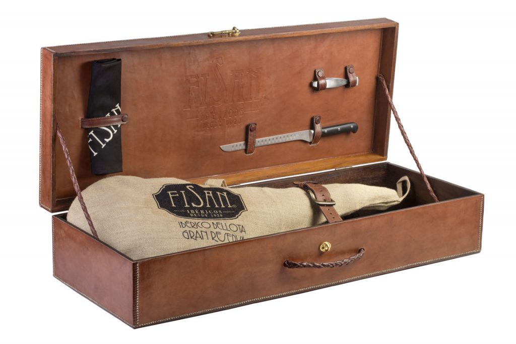 Una joya como esta requería un packaging a su altura, por lo que se presenta en una caja de madera forrada a mano en cuero natural que incluye todo lo necesario para disfrutarlo: cuchillo jamonero, pinzas, delantal y paño. Su precio de venta recomendado es 1.100 euros y este año, como novedad, también puede adquirirse a través de la tienda online de Fisan www.fisan.es/shop-online y recibirlo cómodamente en casa.