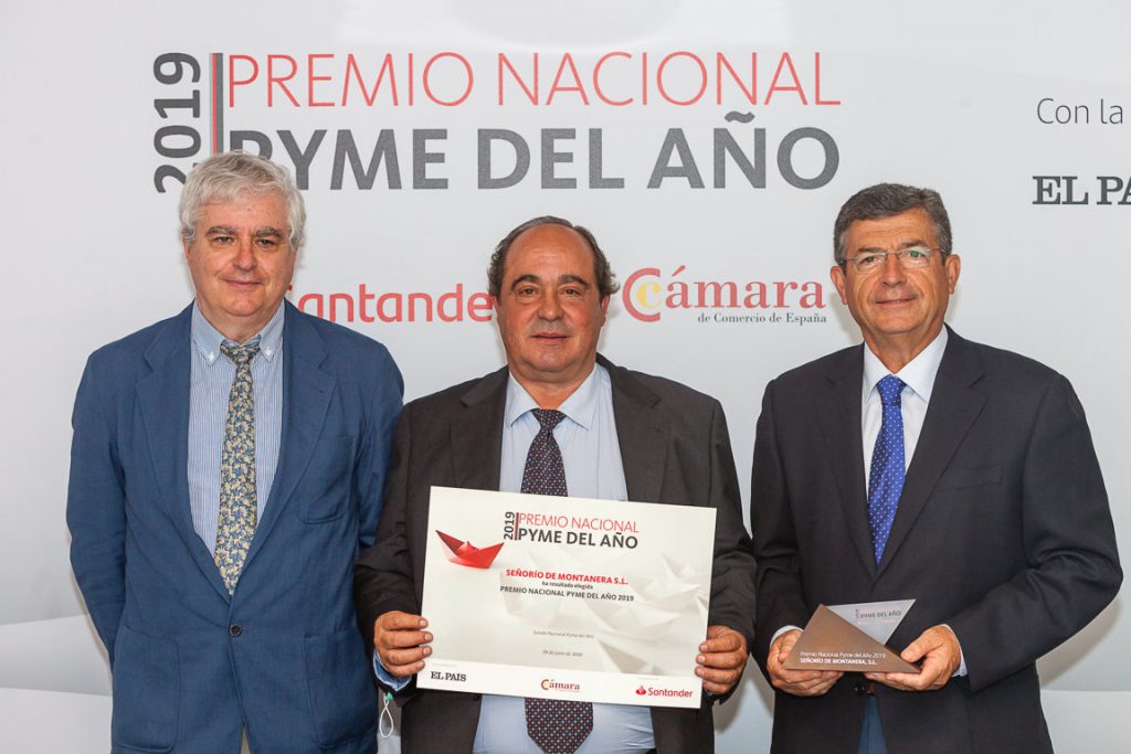 Señorío de Montanera, marca líder en la DOP Dehesa de Extremadura, ha recibido el Premio Nacional Pyme del Año 2019, un galardón otorgado por la Cámara de Comercio de España y el Banco Santander que pretende reconocer la labor de las pequeñas y medianas empresas de nuestro país como motor de crecimiento económico. La creación de empleo indefinido, respeto al medio ambiente, planes de formación para sus trabajadores, sus iniciativas de innovación y digitalización y los proyectos de Responsabilidad Social Corporativa justifican la elección de esta empresa extremeña. De izquierda a derecha, Francisco Espárrago (presidente de Señorío de Montanera), Eduardo Ramos (consejero delegado de Señorío de Montanera) y Juan Barrena (consejero de Señorío de Montanera).