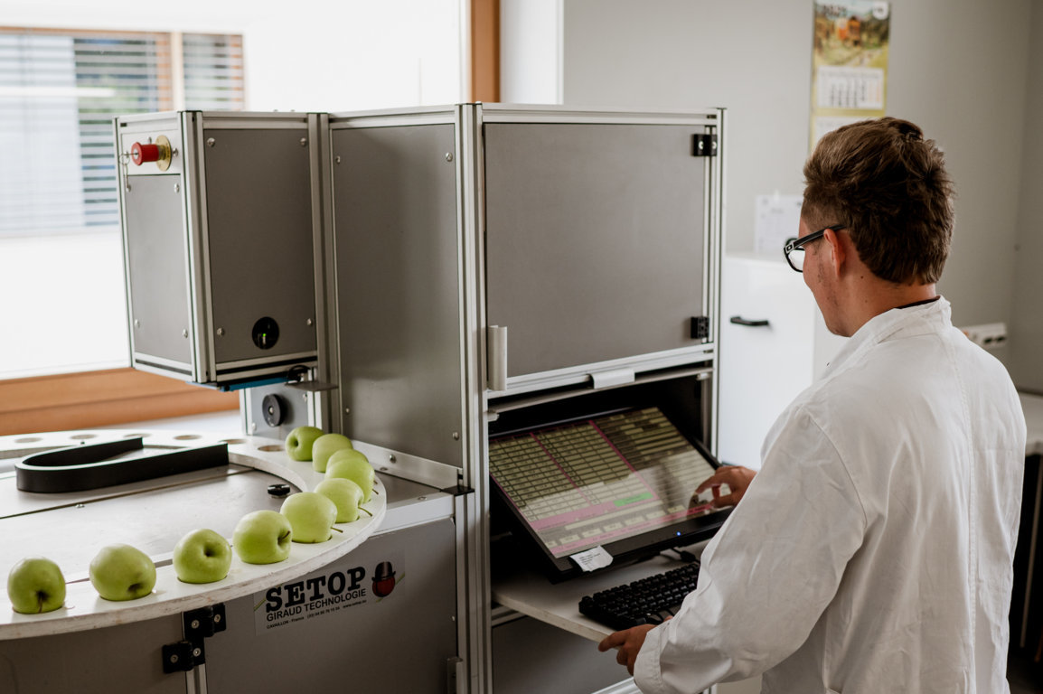 .Cada manzana se fotografía hasta 60 veces en pocos segundos dentro de cabinas especiales. Un sistema informático analiza el tamaño, el color y la calidad, clasificando automáticamente los frutos según criterios homogéneos. Este proceso garantiza una selección precisa, objetiva y constante.