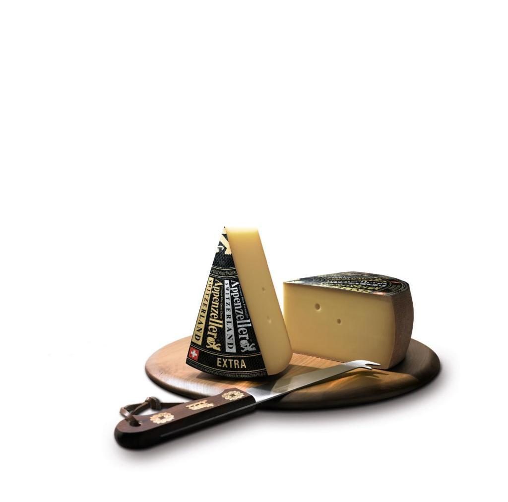 Desde el idílico Appenzellerland (pintoresca región localizada en el noroeste de Suiza, entre los Alpes y el lago de Constanza), llega Appenzeller Extra, un queso elaborado de la manera tradicional con leche cruda de vacas que se alimentan libremente en los pastos de las montañas y prados. Además, como en el caso de otros quesos suizos, es apto para intolerantes al gluten y a lactosa. Durante el proceso de maduración, cada uno de los quesos se tratan regularmente con una salmuera – una mezcla de hierbas que únicamente conocen 2 personas en todo el mundo. En el caso de la variedad Appenzeller Extra, los maestros queseros seleccionan únicamente aquellas ruedas aptas para una larga maduración, pues reposarán en la cava un periodo mínimo de 6 meses mientras que un Appenzeller clásico, lo hace sólo 3 meses. Durante el proceso de curación, el queso adquiere un picante regusto que lo convierten en el favorito de los más sibaritas.
