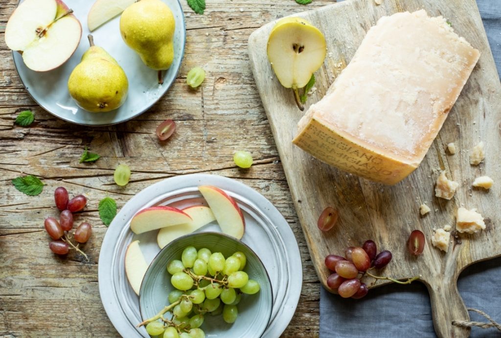 Miel, nueces, avellanas, fruta fresca o vinagre balsámico tradicional de Módena… Repasamos algunas de las excelsas combinaciones con las que disfrutar del Parmigiano Reggiano en sus distintas maduraciones. En la imagen, Parmigiano Reggiano con uvas, pera y manzana.