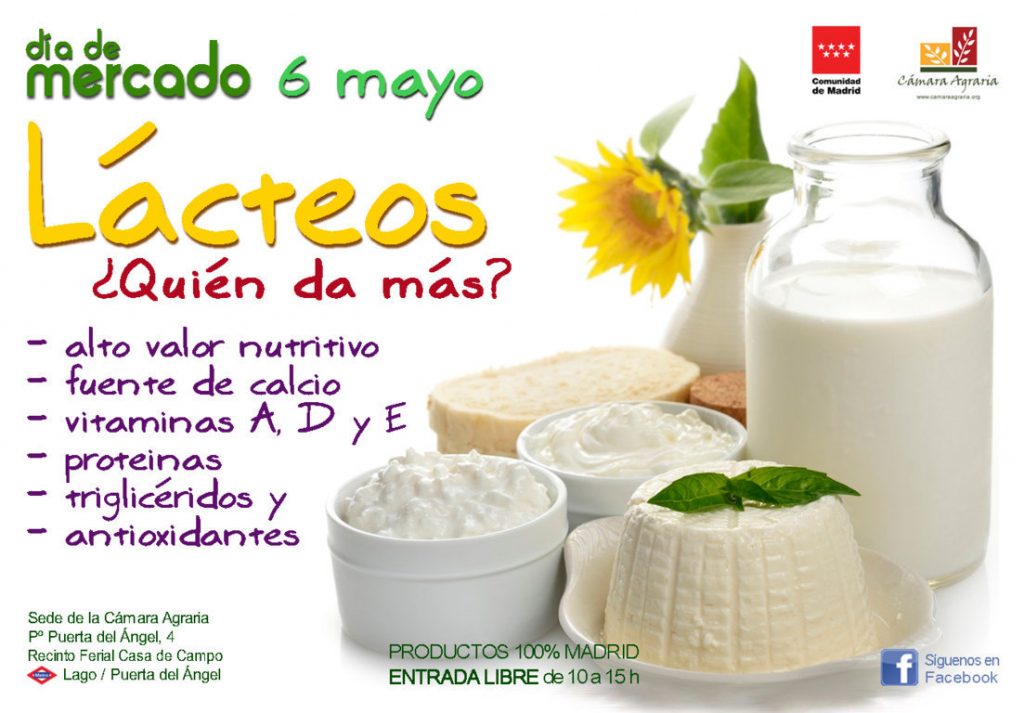 Los lácteos son alimentos muy completos desde el punto de vista nutricional: fuente de calcio, de vitaminas, de proteínas, de triglicéridos y de antioxidantes. El consumo continuado y adecuado de lácteos contribuye a prevenir enfermedades cardiovasculares, diabetes, obesidad, osteoporosis…… El Día de Mercado de la Cámara Agraria de Madrid del sábado 6 de mayo (entrada libre de 10 a 15 horas en su sede de la Casa de Campo) estará especialmente dedicado a los productos lácteos. Estarán presentes quince queserías madrileñas, algunas habituales del Día de Mercado, y otras que acuden por primera vez como Quesería Jaramera y Arroyo del Endrinal.