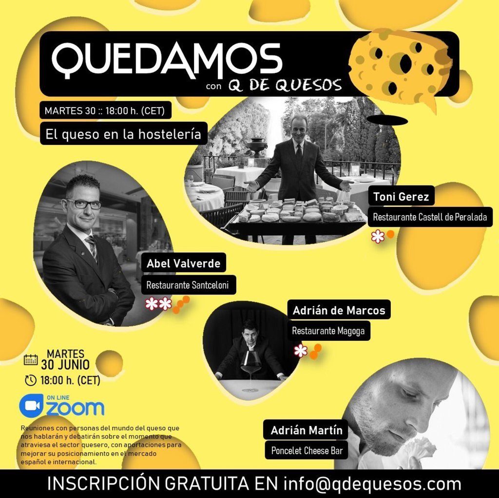 QdeQuesos.com, portal referente del sector quesero en España ha puesto en marcha durante el mes de junio “Quedamos con QdeQuesos”, unas webinars que tienen como protagonista al sector quesero. Mañana, 30 de junio, se cerrará el mes con la jornada sobre el Queso en la Hostelería con cuatro protagonistas de restaurantes nacionales donde el queso tiene una presencia destacada: Abel Valverde. Restaurante SantCeloni (Madrid); Toni Gerez. Restaurante Castell de Perelada (Girona); Adrián de Marcos. Restaurante Magoga (Cartagena) y Adrián Marín. Restaurante Poncelet Cheese Bar (Madrid).