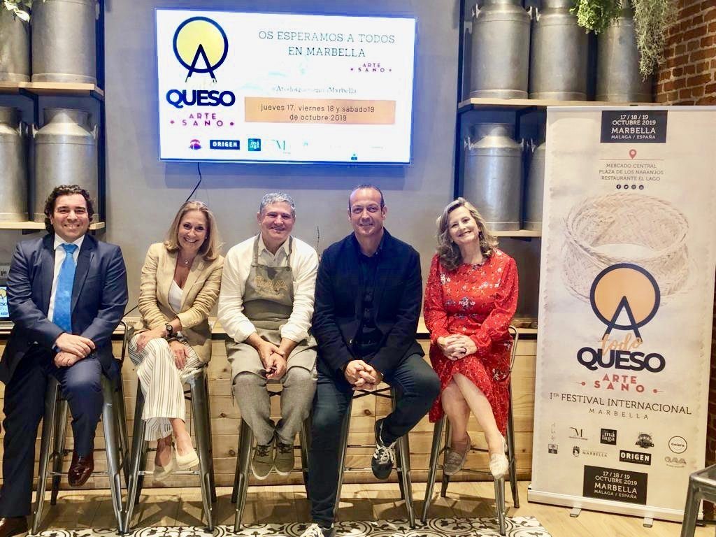 ORIGEN se ha involucrado, junto a Marbella All Stars, en la organización de «A Todo Queso», Festival Internacional de los Quesos Artesanos, que se desarrolla, desde mañana y hasta el sábado, 19 de octubre, en diferentes escenarios de Marbella. En la imagen, los participantes en el acto de presentación que tuvo lugar en Madrid. De izquierda a derecha el representante de Comercial Galera, distribuidora líder de productos lácteos en Málaga; Marta Raspall, consejera de Eumedia (editora de ORIGEN) y María Asenjo, directora de Marbella All Stars; José Luis Martín y Paco García, directores técnicos del certamen; y María Asenjo, directora de Marbella All Stars.