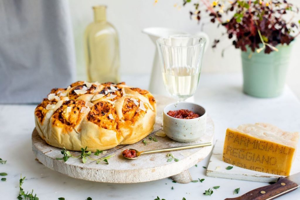 Después de este tiempo, extienda la masa sobre una tabla enharinada y con un rodillo forme un rectángulo de unos 45×30. Extienda la pasta de tomate seco sobre la masa, a 2 cm de los bordes, y espolvoree con el Parmigiano Reggiano y la almendras fileteadas. Enrolle hasta obtener un cilindro estrecho con el pliegue hacia abajo.