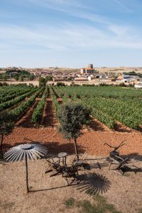 En Araus Ballesteros ocurre al contrario: la decoración la da el propio pueblo, cuyo skyline se extiende en el cercano horizonte del viñedo que rodea a la bodega. Estamos ahora en Villahoz, una apacible localidad que también guarda buen ejemplo de la arquitectura y el urbanismo popular castellano. En el jardín que se extiende entre la bodega y el viñedo, Marile nos cuenta cómo un día decidió dejar su trabajo en Bur