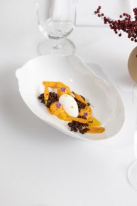 Hay una relación muy estrecha con algunos productores (“con los que compartimos la filosofía porque, de lo contrario, es muy difícil que nos entendamos”) como los que están detrás del Latón de La Fueva (Huesca), cerdos felices que campan a sus anchas en el Pirineo aragonés y cuyo producto es protagonista incluso estético en las partes iniciales del menú. Como la nata de Sieso de Huesca con la que elaboran una mantequilla que es otro de los emblemas de la casa. O las alcaparras de Caspe. O las trufas negras, que proceden de una trufera de un pueblo cercano a Cariñena, que las suministra, en sus diferentes variedades, a lo largo de todo el año.